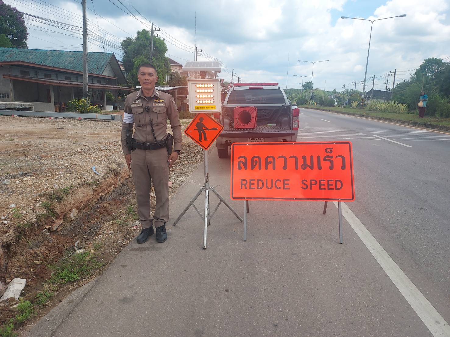 ร.ต.อ.ก้องเกียรติ ราชพลสิทธิ์ รอง สวปสภ.ปากจั่นนำป้ายชลอความเร็ว และไฟกระพริบ มาวางเพื่อให้รถได้ชลอความเร็ว ก่อนถึงจุดตรวจหลัก บริเวณ หน้าโรงพักหลังเก่า ของ สภ.ปากจั่น