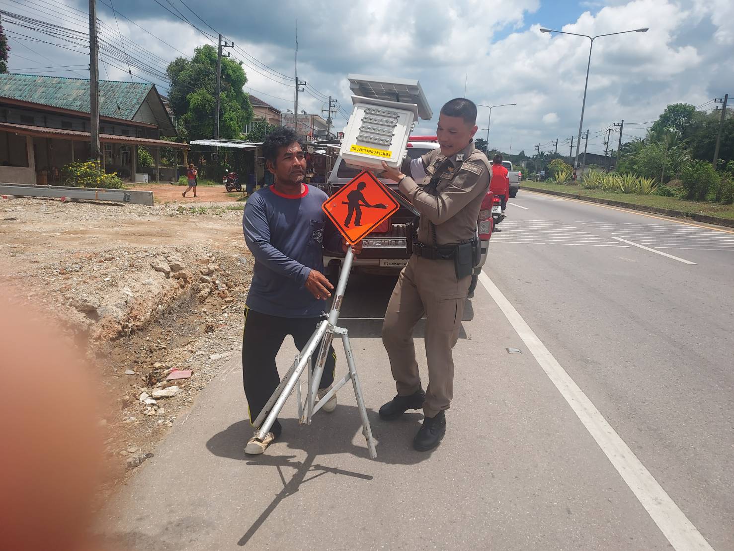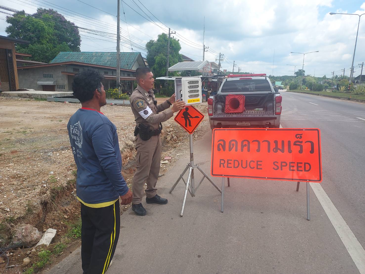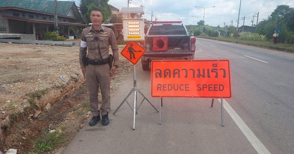 ร.ต.อ.ก้องเกียรติ ราชพลสิทธิ์ รอง สวปสภ.ปากจั่นนำป้ายชลอความเร็ว และไฟกระพริบ มาวางเพื่อให้รถได้ชลอความเร็ว ก่อนถึงจุดตรวจหลัก บริเวณ หน้าโรงพักหลังเก่า ของ สภ.ปากจั่น
