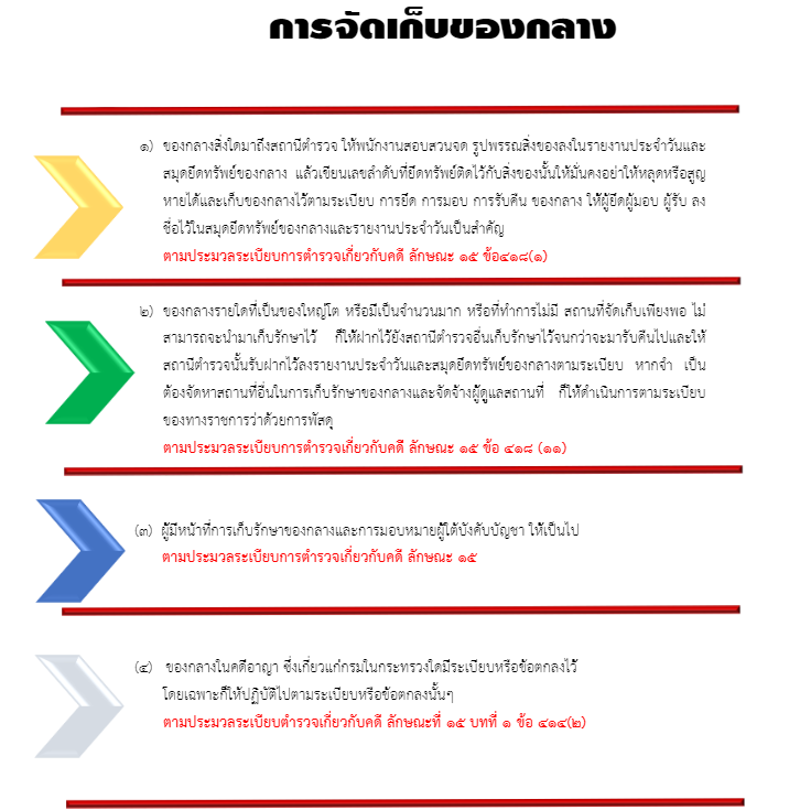 แสดงการวางระบบการจัดเก็บรักษาของกลาง ที่ยึด อายัดเพื่อป้องกันไม่ให้ถูกลับเปลี่ยน หรือไม่นำเข้าระบบ หรือเข้าระบบบางส่วน เพื่อแลกกับการเรียกรับผลประโยชน์ทั้งทางคดี และรับทรัพย์สินมีระบบควบคุมที่เพียงพอ และเหมาะสมตามประเภทของกลางนั้น ๆ